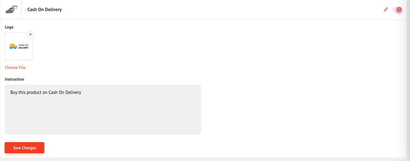 In the upper image, you can see we configure cash on delivery and save it. You can On/Off method status.