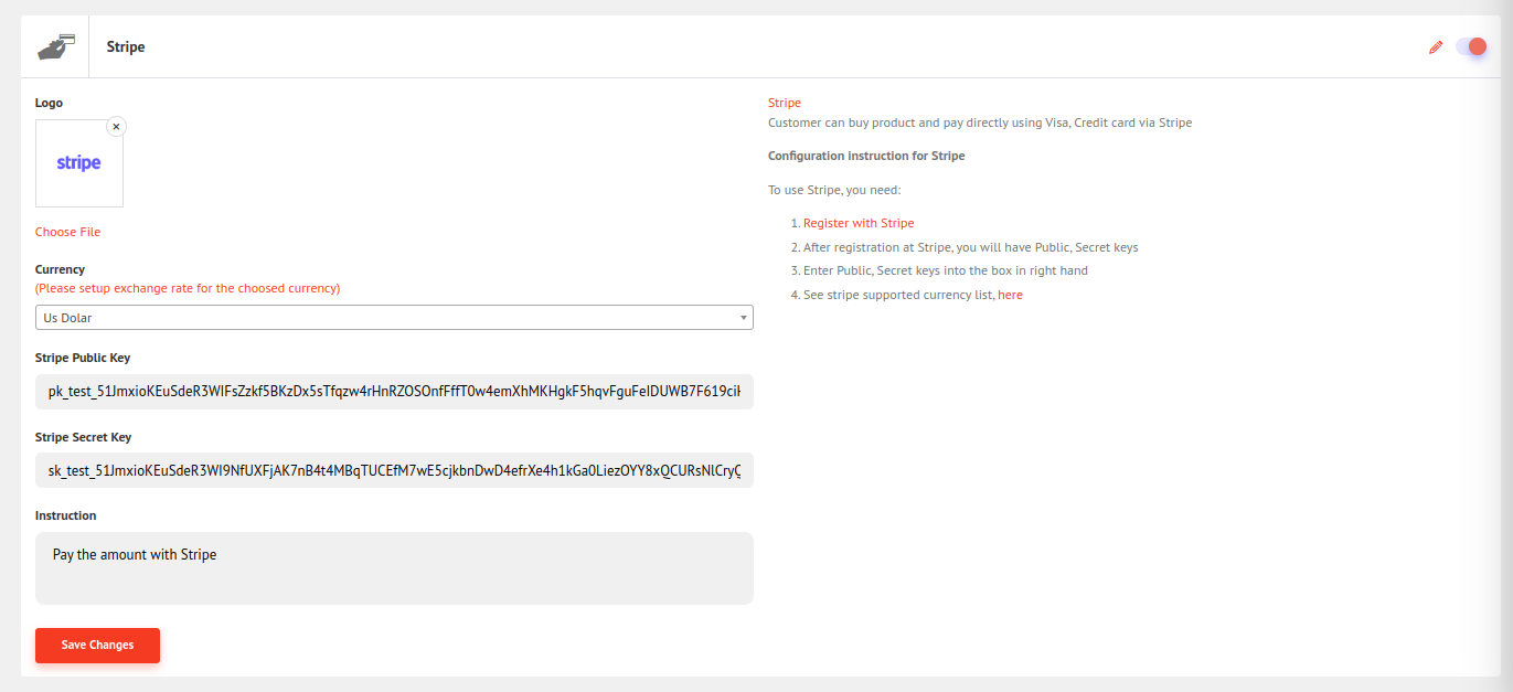 For Stripe public key and public secret key follow the link https://stripe.com/ and register. After registering, you will be given the public key and public secret key. Now fill in the field and click save changes.