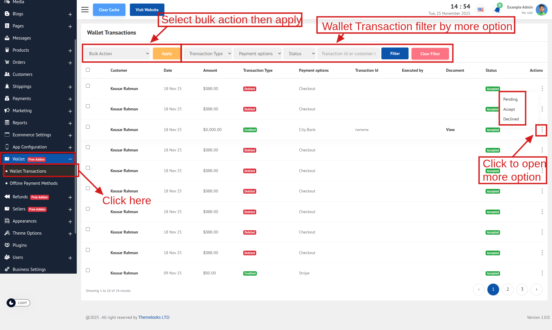 You can filter transaction records by payment transaction options, transaction types, transaction status, and by searching. Also Can change transaction status.